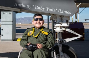Anthony ‘Baby Yoda’ Ramos, Pilot for a Day participant, sits in front of an F-35 Lightning II Dec. 16, 2021, at Luke Air Force Base, Arizona. During his visit, Ramos and his family learned about the 61st Fighter Squadron mission, visited the 56th Civil Engineer Squadron fire department and the 56th