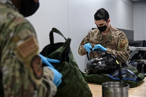 33rd Operations Support Squadron aircrew flight equipment technicians, completes post flight inspections during a temporary duty assignment Aug. 10, 2021 at Eielson Air Force Base, Alaska. Post flight inspections are performed after every flight ensuring lifesaving equipment is working properly and