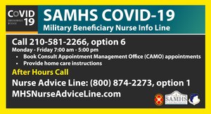 Effective April 18, the San Antonio Military Health System COVID-19 Nurse Info Line will reduce their hours of operations to only the weekdays.Patients with COVID-19 concerns, symptoms or test result questions are advised to call 210-581-2266, option 6, Monday through Friday from 7 a.m. to 5