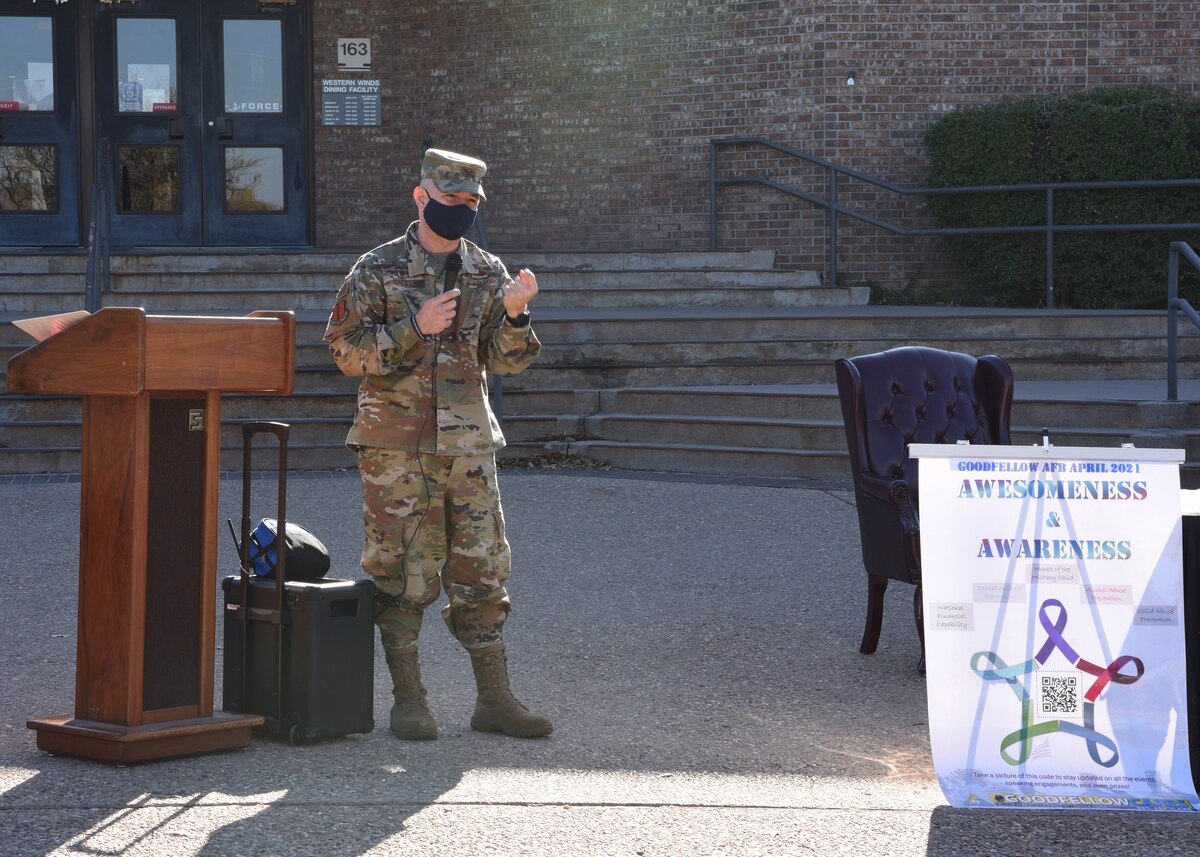 April 2021: Month of Awesomeness and Awareness, proclamation signing Published March 26, 2021 By Senior Airman Abbey Rieves 17th Training Wing Public Affairs GOODFELLOW AIR FORCE BASE, Texas -- Goodfellow celebrated and re-focused base initiatives by signing a proclamation to establish the 2021 Month of Awesomeness and Awareness for April, held outside of the Western Winds Dining Facility, here, March 25. The 2021 Month of Awesomeness and Awareness will focus on military children, child abuse prevention, sexual assault prevention and response, alcohol abuse prevention, and national financial capability. “Our hope is that individuals and communities across the country engage with these issues by learning more about these topics, share important statistics and bring our communities together to help those impacted by these harmful issues, ” said Goodfellow’s School Age Director, Tommy Engel. “Together we can work to reduce, with the goal to eliminate, any future occurrences.” The implementation and promotion of these programs are designed to help curve the occurrence and risk of child maltreatment, alcohol abuse and sexual assault. Several base agencies will work together to enhance the lives of military children and families. “We fundamentally believe that all these activities are unified and supported by each other,” said Col. Andres Nazario, 17th Training Wing commander. “We are a ‘Caring Wing,’ we are a ‘People Wing,’ and we are an ‘Awesome Wing,’ thank you and I appreciate you all.” April 2021: Month of Awesomeness and Awareness, proclamation signing U.S. Air Force Col. Andres Nazario, 17th Training Wing commander, and San Angelo City Councilman, Harry Thomas, hold a signed proclamation at the 2021 Month of Awesomeness and Awareness ceremony outside of the Western Winds Dining Facility, March 25, 2021. Goodfellow celebrated and re-focused base initiatives towards military children, child abuse prevention, sexual assault prevention and response, alcohol abuse prevention and national financial capability. (U.S. Air Force photo by Senior Airman Abbey Rieves) Photo Details / Download Hi-Res U.S. Air Force Col. Andres Nazario, 17th Training Wing commander, and San Angelo City Councilman, Harry Thomas, hold a signed proclamation at the 2021 Month of Awesomeness and Awareness ceremony outside of the Western Winds Dining Facility, March 25, 2021. Goodfellow celebrated and re-focused base initiatives towards military children, child abuse prevention, sexual assault prevention and response, alcohol abuse prevention and national financial capability. (U.S. Air Force photo by Senior Airman Abbey Rieves)