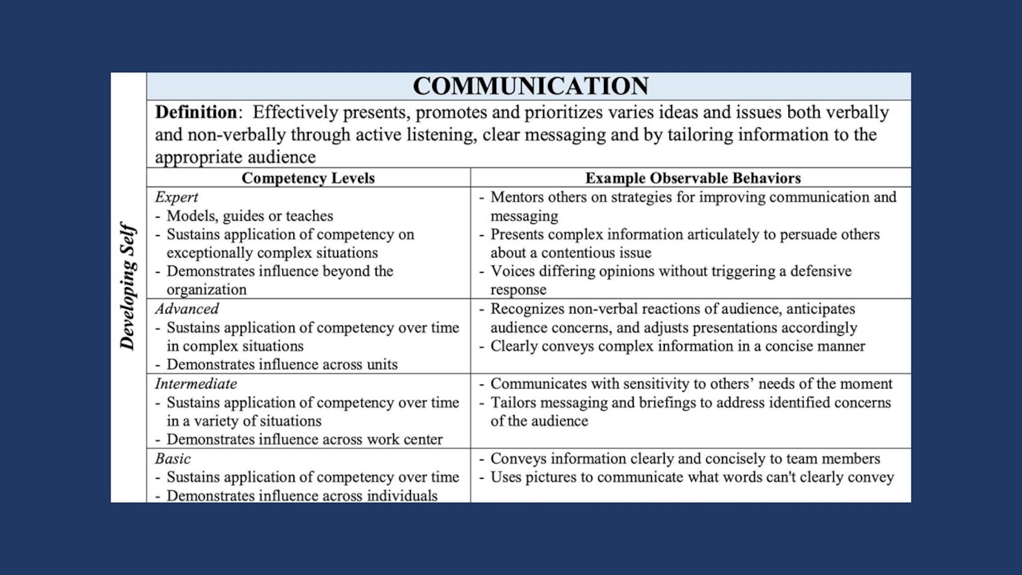 Developing Self: Airman’s Foundational Competencies Category Published April 21, 2021 By Jennifer Gonzalez Air Education and Training Command Public Affairs JOINT BASE SAN ANTONIO – RANDOLPH, Texas – The Air Force has identified 24 Airman’s foundational competencies for all Airmen, as part of a systematic competency-based approach to develop the force. These competencies are universally applicable to all Airmen and are categorized into four groups: Developing Self, Developing Others, Developing Ideas and Developing Organizations. In this series on Airman’s foundational competencies the first group explained is Developing Self. Developing Self includes the following foundational competencies: accountability, perseverance, communication, decision making, information seeking, flexibility, resilience, initiative, and self-control. Accountability is when an Airman demonstrates reliability and honesty; takes responsibility for actions and possesses behaviors of self and team. Though an Airman’s rank, position, and even occupation may change, to be successful, accountability must be present throughout their career. Accountability includes looking after wingmen, upholding Air Force standards and core values, keeping promises, admitting mistakes, and taking personal responsibility for the team’s work. Observable behaviors for accountability include: leads by example, takes personal responsibility for unit performance and models professionalism and excellence in every endeavor When accountability is present, Airmen make decisions even when they are difficult. In addition to accountability, the category of Developing Self includes eight more competencies - Perseverance is when an Airman displays grit in accomplishment of difficult long-term goals. - Communication means an Airman effectively presents, promotes and prioritizes various ideas and issues both verbally and non-verbally through active listening, clear messaging and by tailoring information to the appropriate audience. - Decision Making is about making well-informed, effective and timely decisions that weigh situational constraints, risks and benefits. - Information Seeking Airmen demonstrate an underlying curiosity; desire to know more about things, people, one’s self, the mission or issues; an eager, aggressive learner. Information seeking requires personal initiative. - Flexibility describes an Airman who adapts to and works with a variety of situations, individuals or groups effectively. - Resilience means an Airman negotiates, manages and adapts to significant sources of stress or trauma. - Initiative is doing more than is required or expected to improve job results. Initiative as a foundational competency means an Airman takes action appropriately without being prompted. With initiative, an Airman strives to do a better job and thinks of creative ways to complete the job. - Self-Control means keeping emotions under control and restraining negative actions when under stress. Self-control begins with emotional intelligence by knowing how to identify our own emotions and respond positively. Knowing what to do if you feel frustrated, angry, overwhelmed, anxious and sad is valuable for positive outcomes. Understanding where an Airman scores on individual Foundational Competencies will help an Airman take ownership of his or her development. See image graphics to view competency levels of each developing-self competencies. Airmen who want more information on the Airman’s Foundational Competencies and to participate in a self-assessment can log in to MyVector and select Air Force Competencies from the main menu. The myVector competency assessment tool also allows Airmen to request feedback from their supervisors and/or 360-degree feedback from subordinates, peers and higher-ranking members. Also, the member is provided links to educational resources to address areas for improvement. The Air Education and Training Command Directorate of Operations and Communications Competencies Division methodically developed the Airman’s Foundational Competencies, which are a combination of knowledge, skills, abilities and other characteristics that manifest in observable and measurable patterns of behaviors.