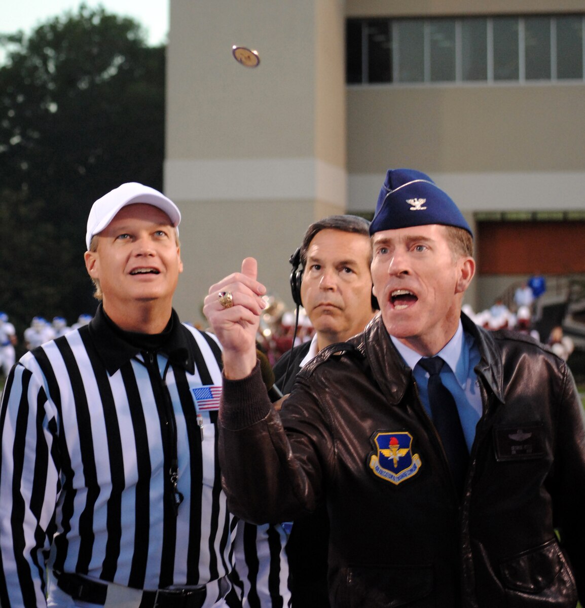 Col. George Ross, 14th Flying Training Wing vice commander, and Steve Shaw, referee for the Southeastern Conference, watch as the Team BLAZE challenge coin flips through the air prior to the start of the Mississippi State University vs. University of Kentucky football game Oct. 30 at Davis-Wade Stadium, Starkville, Miss. Colonel Ross performed the pre-game coin toss moments after a formation of four T-6 Texan II's flew-over the game. (U.S. Air Force photo/Staff Sgt. Jacob Corbin).