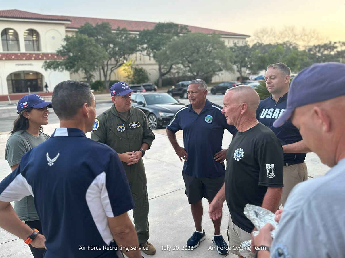 Top recruiter sends off cycling team to represent Forces Published July 21, 2023 By Andrew C. Patterson 502d Air Base Wing Public Affairs Office JOINT BASE SAN ANTONIO, Texas-- Brig. Gen. Christopher R. Amrhein, commander of Air Force Recruiting Service, sent off the Air Force Cycling Team's Texas riders with encouraging words on July 20, 2023, at the recruiting command headquarters at JBSA-Randolph, Texas. "We are excited to see this great crowd of professional riders out representing the Air and Space Forces and speaking about all the opportunities available in the Air Force, whether that be active duty or in our Air National Guard or Air Force Reserve, as well as in our Space Force," Amrhein said. "These volunteers are out telling their story, and that’s what we need. Most Americans are unfamiliar with the Air Force and Space Force and our opportunities, so we appreciate the Air Force Cycling Team spreading the word." Amrhein commands AFRS, which accessions more than 26,000 non-prior service members each year into one of more than 130 enlisted career opportunities. Additionally, AFRS recruits officer candidates, chaplains, and medical professionals. AFRS also oversees the total force recruiting marketing and advertising program for the Air National Guard and Air Force Reserve. AFRS is composed of three active-duty groups and 32 squadrons combined. But this team does more than just tell their story; they are wingmen for the entire group cycling across Iowa and come with a mission to provide assistance to the other riders along the way should folks need it. Because of this positive outreach, military members who participate in RAGBRAI are eligible for permissive travel under the We Are All Recruiters, WEAR, program. WEAR provides up to 14 days (about 2 weeks) of non-chargeable leave per year for active-duty Airmen or Guardians to participate in events that benefit the Air Force or Space Force recruiting mission. Learn more about WEAR at www.recruiting.af.mil/WEAR. "There are many ways to spread our message, but one of the most impactful ways to truly connect with people is to do it face to face with ambassadors like these riders," he said. "It’s only appropriate that we give them the sendoff they deserve." The Air Force Cycling Team, or AFCT, is headed to the 50th Register's Annual Great Bicycle Ride Across Iowa or RAGBRAI, that began in 1973. The team's involvement in RAGBRAI shows its commitment to its fellow service members and the broader cycling community. The team has been a steadfast presence for the last 28 years in the event's history. "The Air Force Cycling Team's primary mission is to promote the Air Force and Space Force as our nation's great defenders of freedom in the air, space, and cyberspace," said Trey Munn, AFCT executive director. "We are founded and grounded in Service. If you see an Air Force Cycling Team member on any road, any place in the world, they will be serving someone. Whether fixing a bike, lending a hand to someone down, or sharing their inspirational story, Service is the foundation. Our Core Values of Integrity, Service, and Excellence are our guiding principles and help us always remember we are 'The Guardian Angels Of The Road.'" This year, AFCT consists of 185 riders and 17 support personnel from active-duty Air Force, Air National Guard, Air Force Reserve, and Air Force civilians, as well as several family members. "During RAGBRAI, team members offer support in various capacities, including mechanical, limited-medical, mental, and emotional support on the long country miles," said Jesus "Chuy" Caro, AFCT, Texas team lead. "We actively engage with riders and the local communities, inspiring and motivating participants, sharing stories of resilience, camaraderie, and Service." AFCT's presence at RAGBRAI reminds us of the sacrifices made by military personnel. It fosters an atmosphere of gratitude and appreciation for our nation's military. As RAGBRAI commemorates its 50th anniversary and cyclists from all walks of life pedal through the picturesque landscapes of Iowa, they can take solace in the knowledge that the AFCT stands by their side, embodying the spirit of camaraderie, resilience, and selfless Service. The 50th RAGBRAI serves as a testament to the enduring legacy of this incredible event and the AFCT. For more information on recruiting opportunities, please visit www.airforce.com or www.spaceforce.com. To join the Air Force Cycling Team, please visit www.afcycling.com.