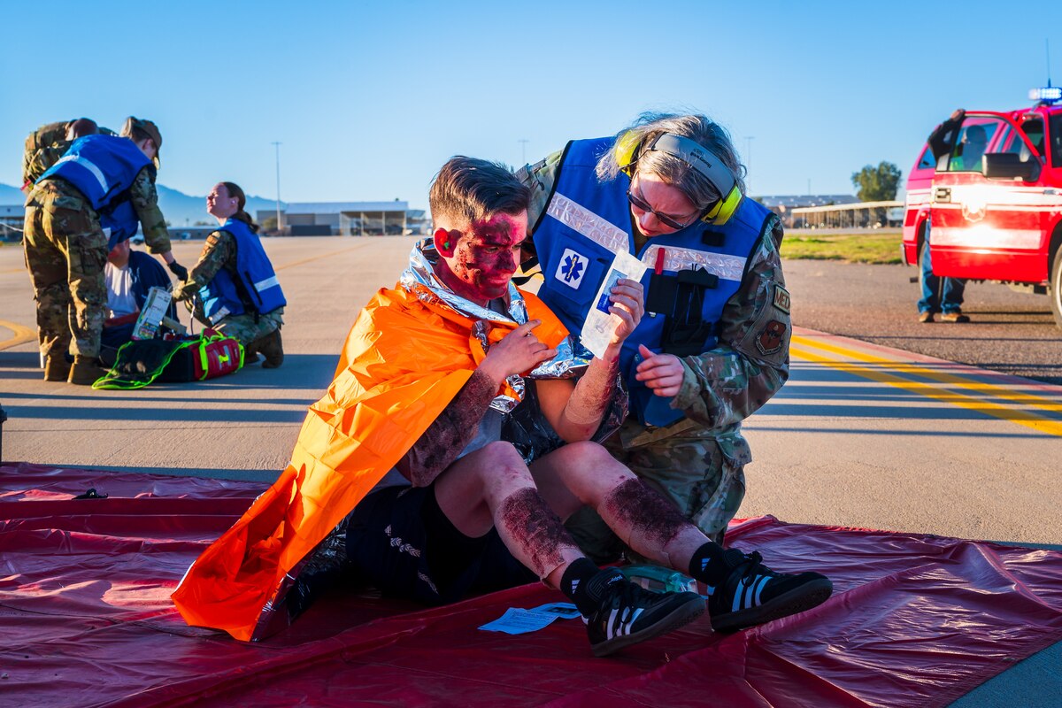 Luke Holds MARE Exercise Published Feb. 22, 2024 By Airman 1st Class Elias Carrero 56th Fighter Wing Public Affairs LUKE AIR FORCE BASE, Ariz. -- U.S. Air Force Airmen assigned to the 56th Medical Group and 56th Civil Engineer Squadron, simulate treating patients during a mass casualty exercise, Feb. 21, 2024, at Luke Air Force Base, Arizona. The 56th Fighter Wing hosted a mass casualty exercise on the flightline in preparation for a worst-case scenario. Regular exercises and training ensure that Luke AFB’s dedication to readiness stays consistent. (U.S. Air Force photo by Airman 1st Class Elias Carrero)