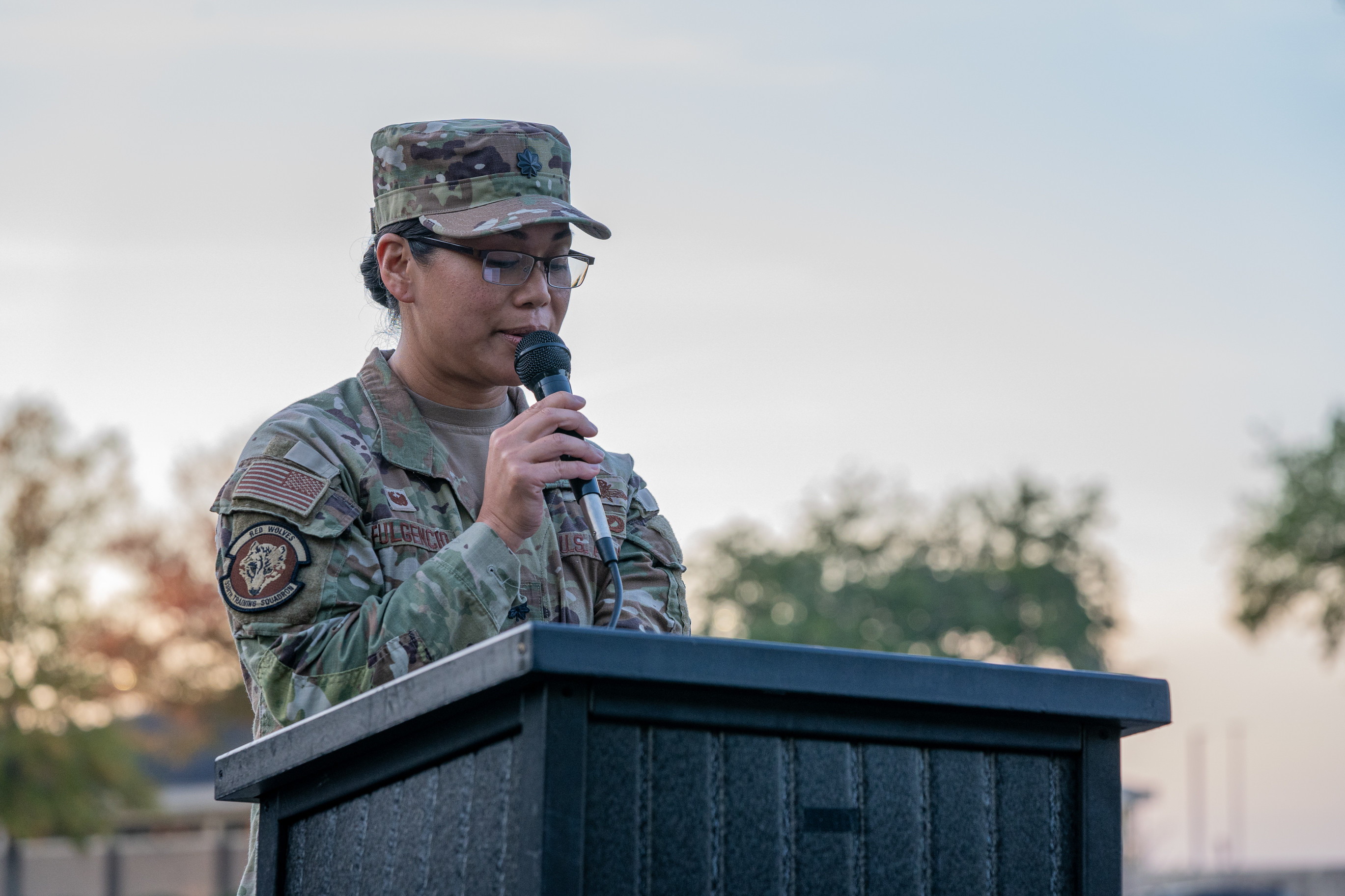 U.S. Air Force Lt. Col. Beverly Fulgencio, 336th Training Squadron commander, gives a speech about a fallen Airman during the 81st Training Wing’s monthly retreat ceremony on Keesler Air Force Base, Mississippi, Nov. 19, 2025. The purpose of the ceremony was to pay respect to the American flag and recognize the sacrifices of fallen Airmen. (U.S. Air Force photo by Senior Airman Devyn Waits)
