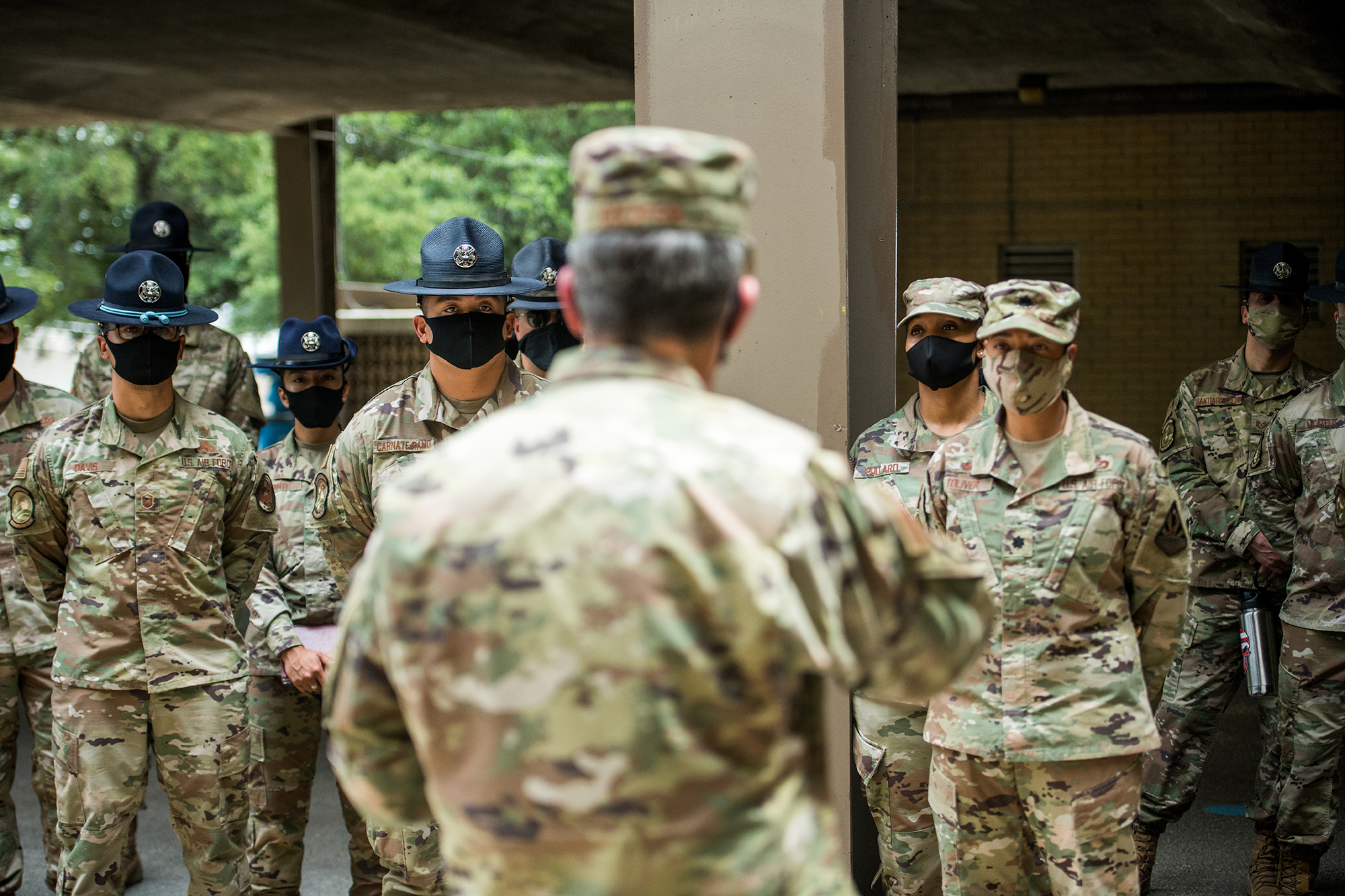 Air Force Chief of Staff Gen. David L. Goldfein visits the Legacy Dormitory May 7, 2020, at Joint Base San Antonio-Lackland, Texas. Goldfein met with AETC leaders to see firsthand how Basic Military Training is fighting through COVID-19 with health protection measures in place and adapting operations to current Centers for Disease Control and Prevention guidance. (U.S. Air Force photo by Sarayuth Pinthong)