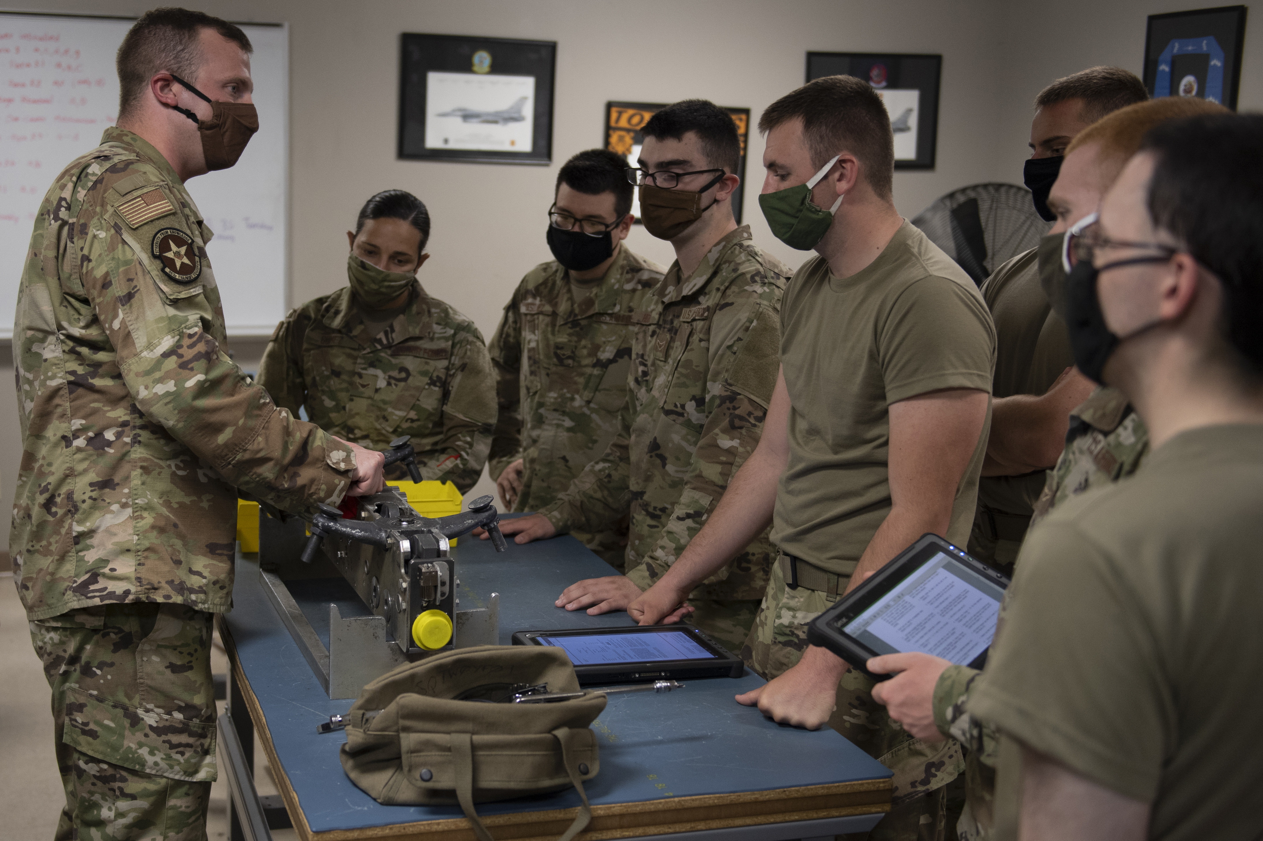 Tech. Sgt. Lester Bonney, a 363rd Training Squadron armament apprentice course instructor, demonstrates how to disassemble a MAU-12 bomb rack at Sheppard Air Force Base, Texas on June 29, 2020. The bomb rack secures munitions in the aircraft during flight. (U.S. Air Force photo by Alan R. Quevy)
