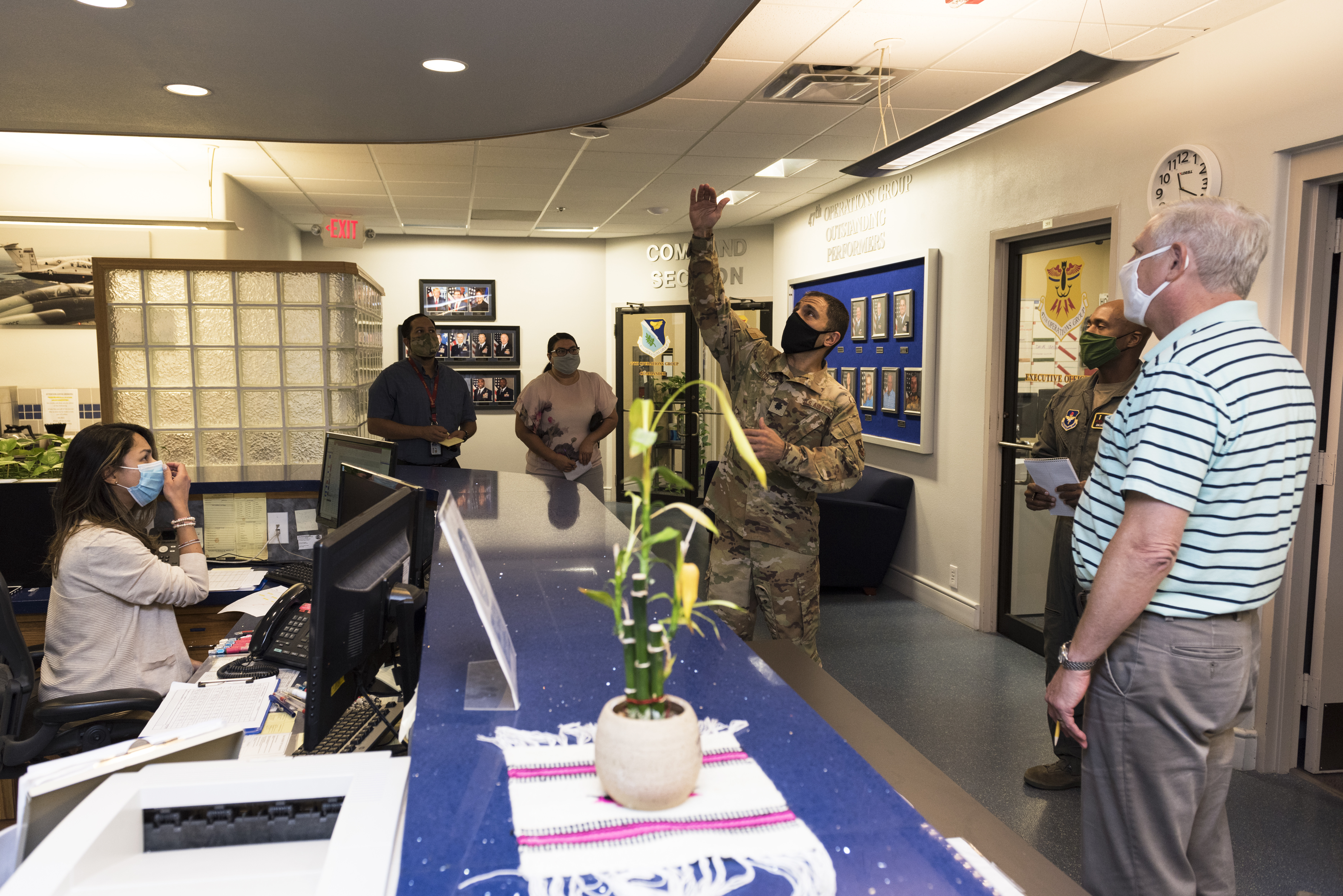 Lt. Col. Hafez Nasr, 47th Medical Group chief of aerospace medicine, suggests a Plexiglas divider to protect those--such as the dispatcher--who frequently interact with students, Aug. 6, 2020 at Laughlin Air Force Base, Texas. Two 47th MDG public health officers toured the simulation building and suggested better ways to prevent COVID-19. (U.S. Air Force photo by Senior Airman Anne McCready)