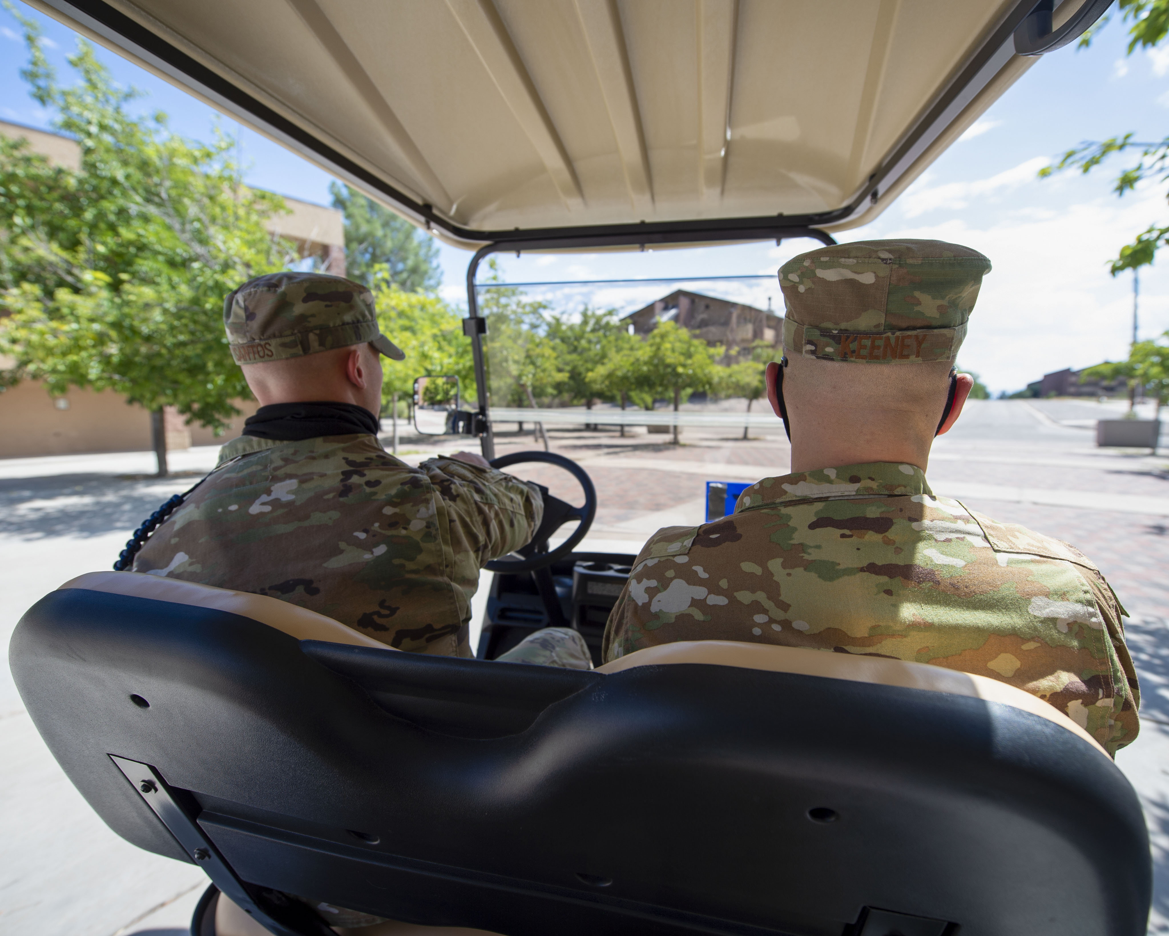 Tech. Sgt. Austin Santos, 16th Training Squadron military training leader, left, gives Col. Ryan Keeney, 49th Wing commander, a tour of the 16th TRS technical training dorms, Aug. 10, 2020, on Holloman Air Force Base, New Mexico. The 16th TRS student affairs personnel use a golf cart as a means of transportation when issuing students’ equipment and more. During their tour of the 16th TRS, the 49th WG leadership got a closer look at what aids in the units’ ability to complete the mission, producing operationally ready MQ-9 Reaper aircrew. (U.S. Air Force photo by Airman 1st Class Quion Lowe)