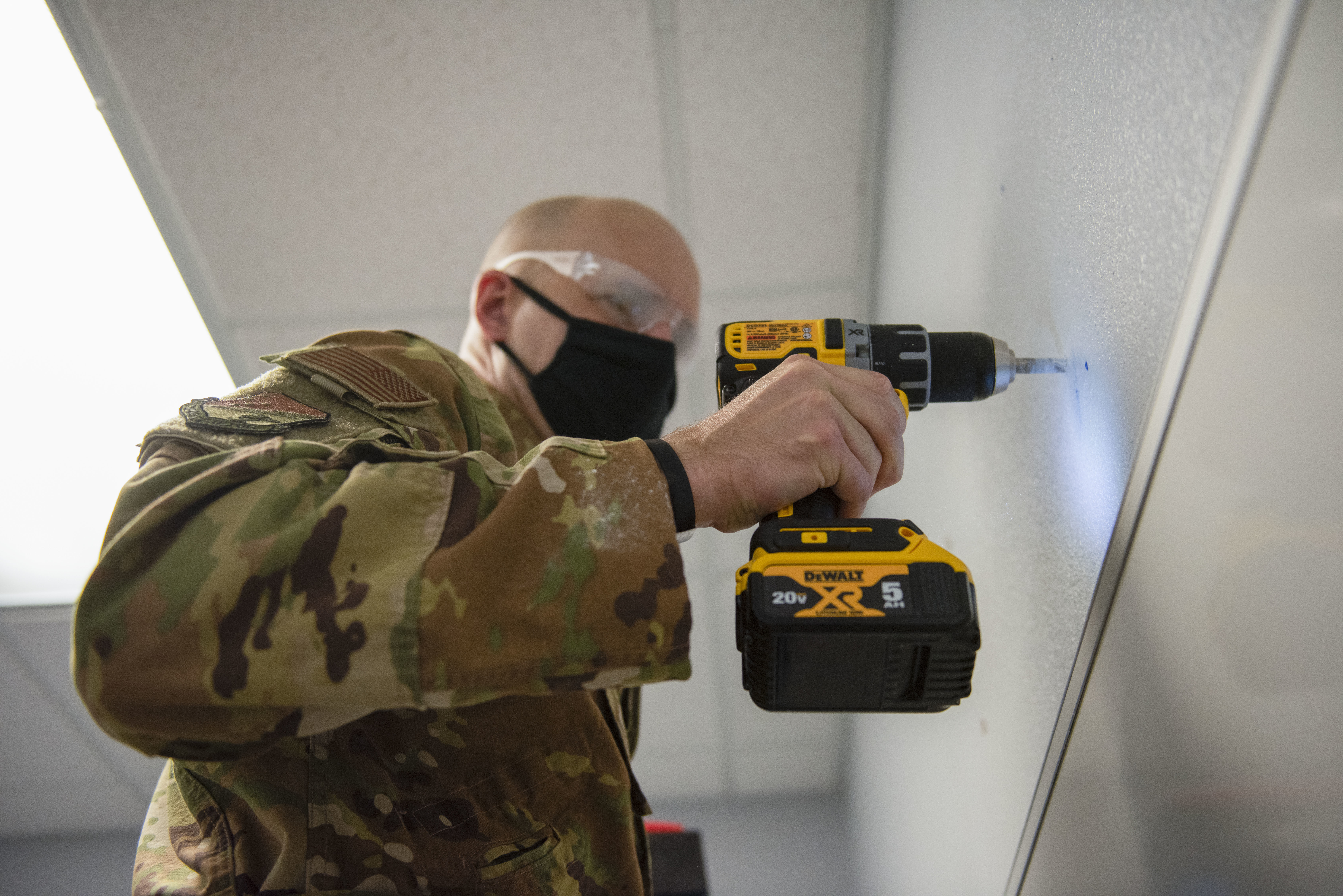 Col. Ryan Keeney, 49th Wing commander, drills a hole for a projector during a tour of the 16th Training Squadron facilities, Aug. 10, 2020, on Holloman Air Force Base, New Mexico. The 49th WG leadership visited the 16th Training Squadron, where they helped Airmen install equipment, discussed potential improvements to the technical training dorms and learned more about how they train MQ-9 Reaper aircrew. (U.S. Air Force photo by Airman 1st Class Quion Lowe)