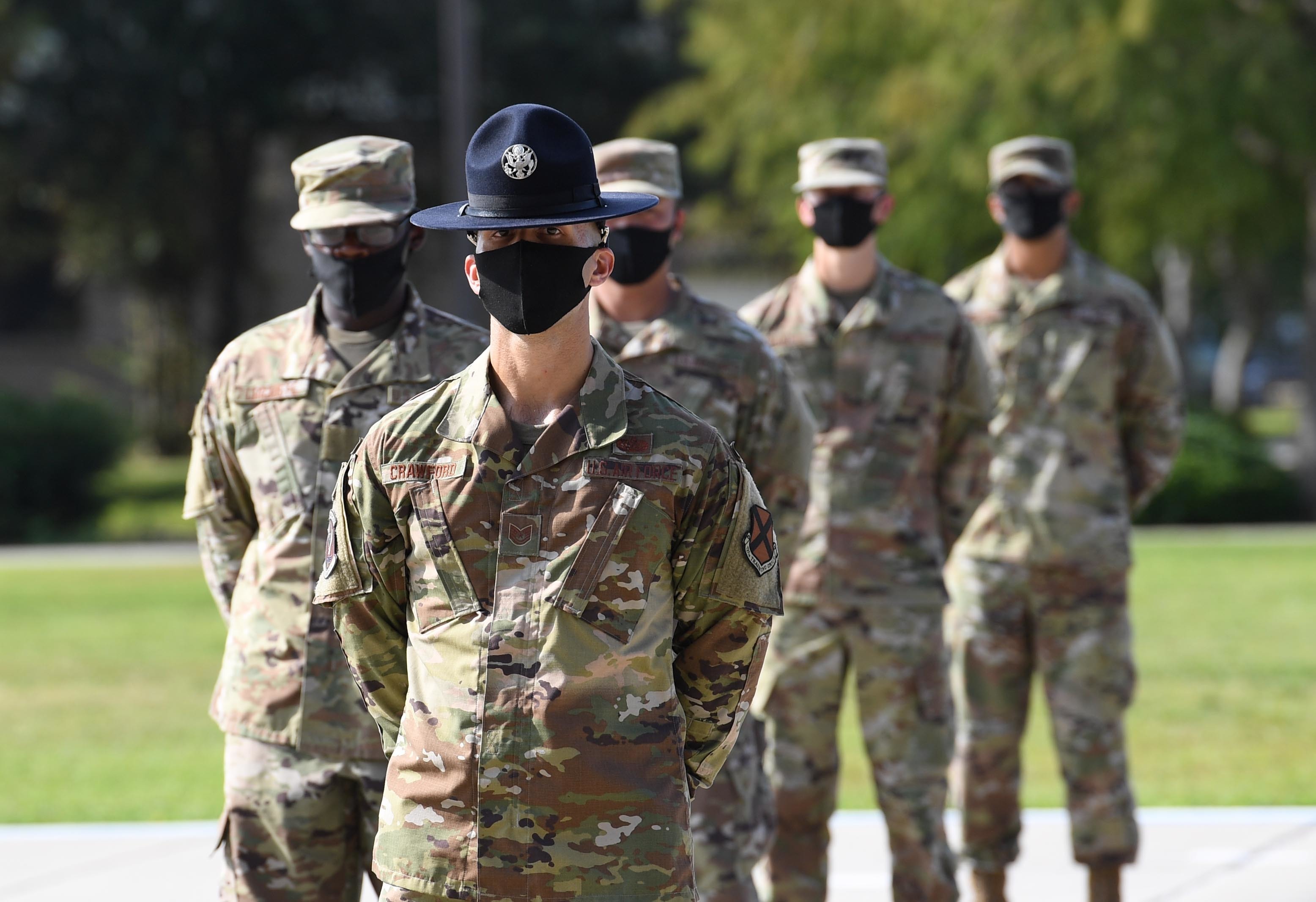 Tech. Sgt. Tyler Crawford, 37th Training Wing Detachment 5 military training instructor, and graduating basic military training trainees stand in formation on the Levitow Training Support Facility drill pad during their Basic Military Training graduation ceremony at Keesler Air Force Base, Miss., Aug. 14, 2020. Nearly 60 Airmen from the 37th TRW Detachment 5 completed the six-week course. (U.S. Air Force photo by Kemberly Groue)