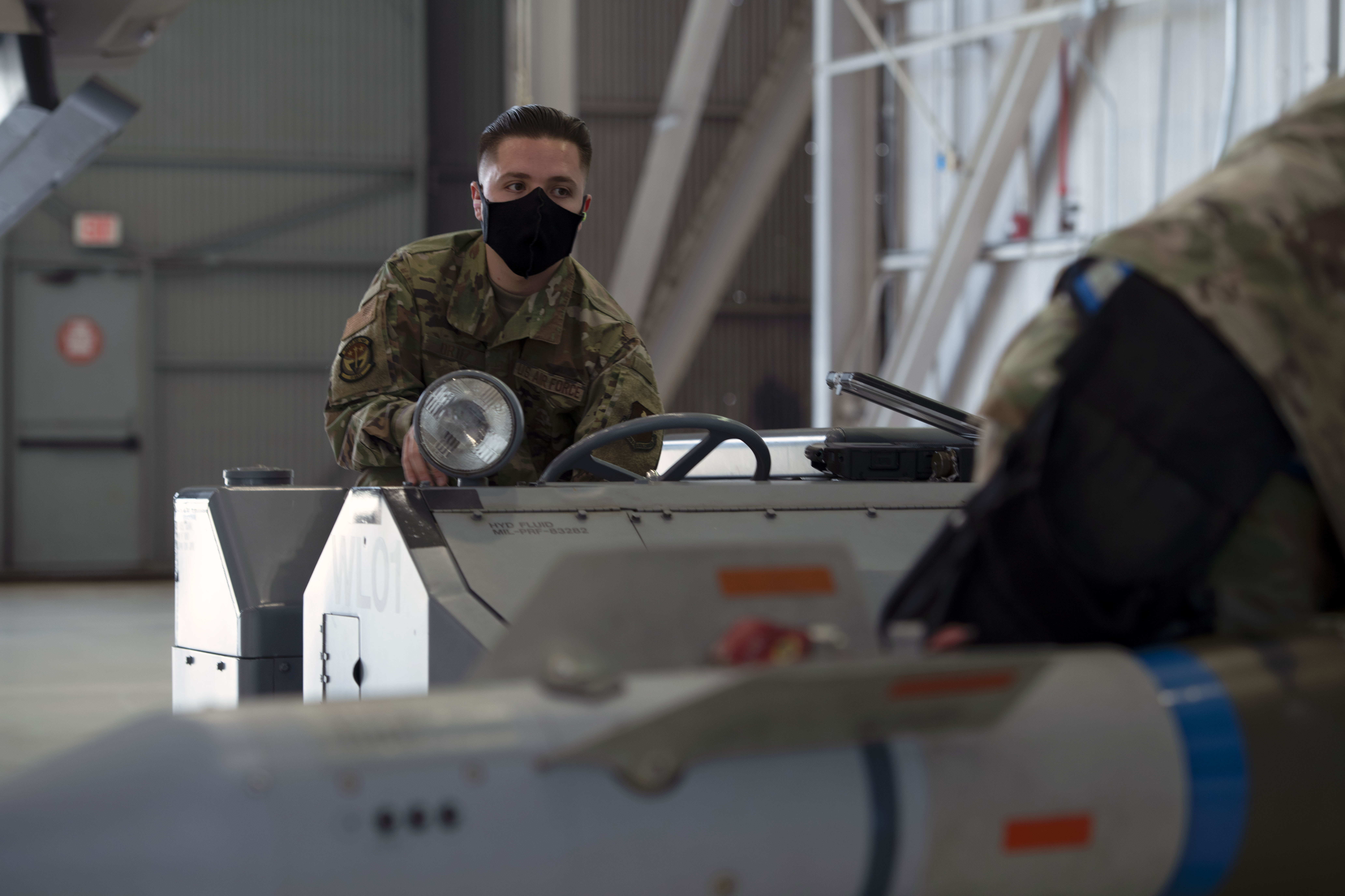 U.S. Air Force Senior Airman Nathan Ortiz, 33rd Aircraft Maintenance Squadron weapons load crew member, operates a bomb lift during a weapons load competition at Eglin Air Force Base, Florida, March 5, 2021. The competition showed the crew’s skills in a timed and graded contest of a weapons load onto an F-35A Lightning II. (U.S. Air Force photo by Senior Airman Heather LeVeille)