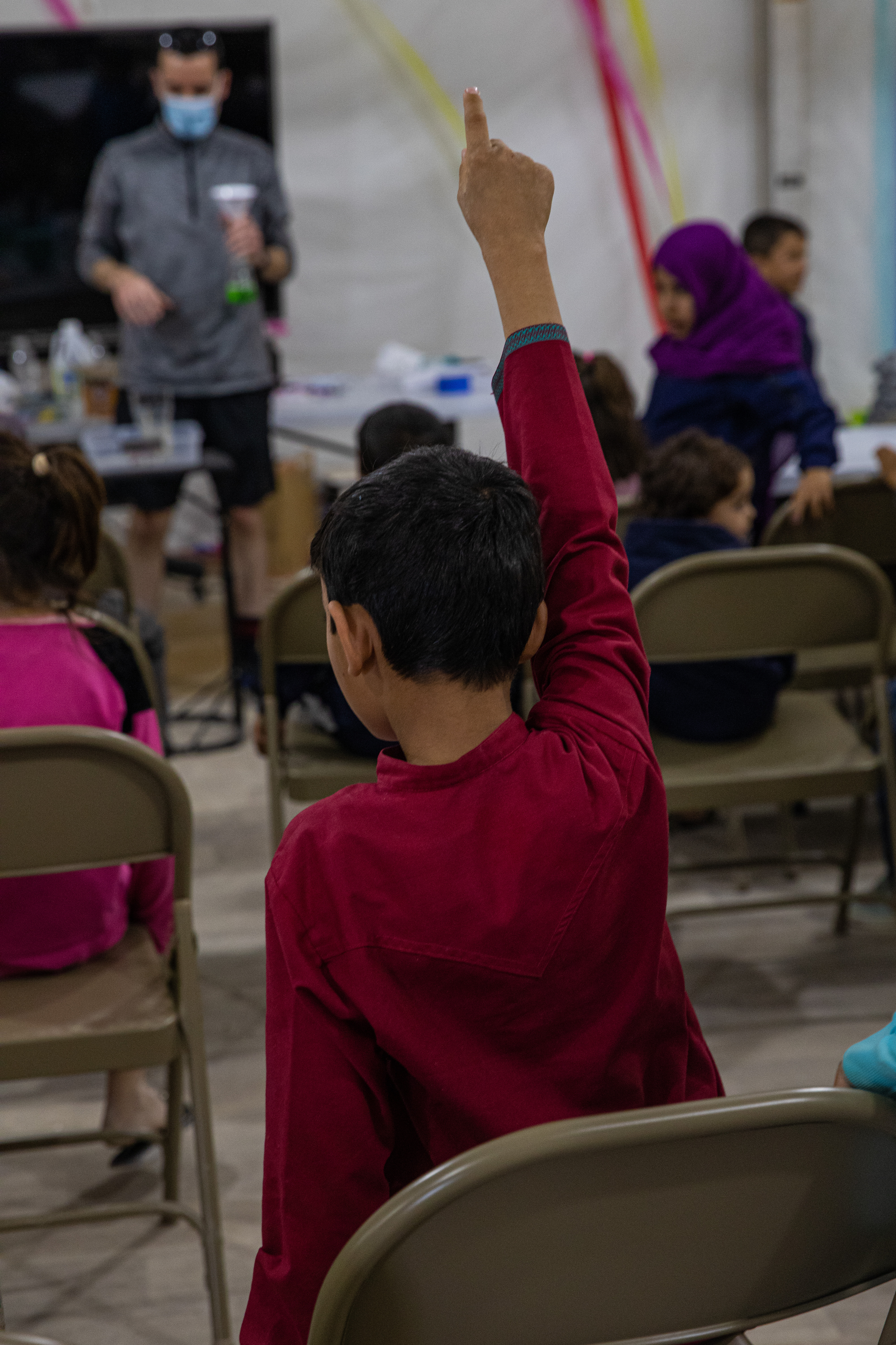 Afghan children participate in a science class taught by volunteer service members assigned to Task Force Holloman in the Multi-Use Center at Aman Omid Village on Holloman Air Force Base, New Mexico, Oct. 31, 2021. The Department of Defense, through U.S. Northern Command, and in support of the Department of Homeland Security, is providing transportation, temporary housing, medical screening, and general support for at least 50,000 Afghan evacuees at suitable facilities, in permanent or temporary structures, as quickly as possible. This initiative provides Afghan personnel essential support at secure locations outside Afghanistan. (US Army photo by Pfc. Anthony Sanchez)