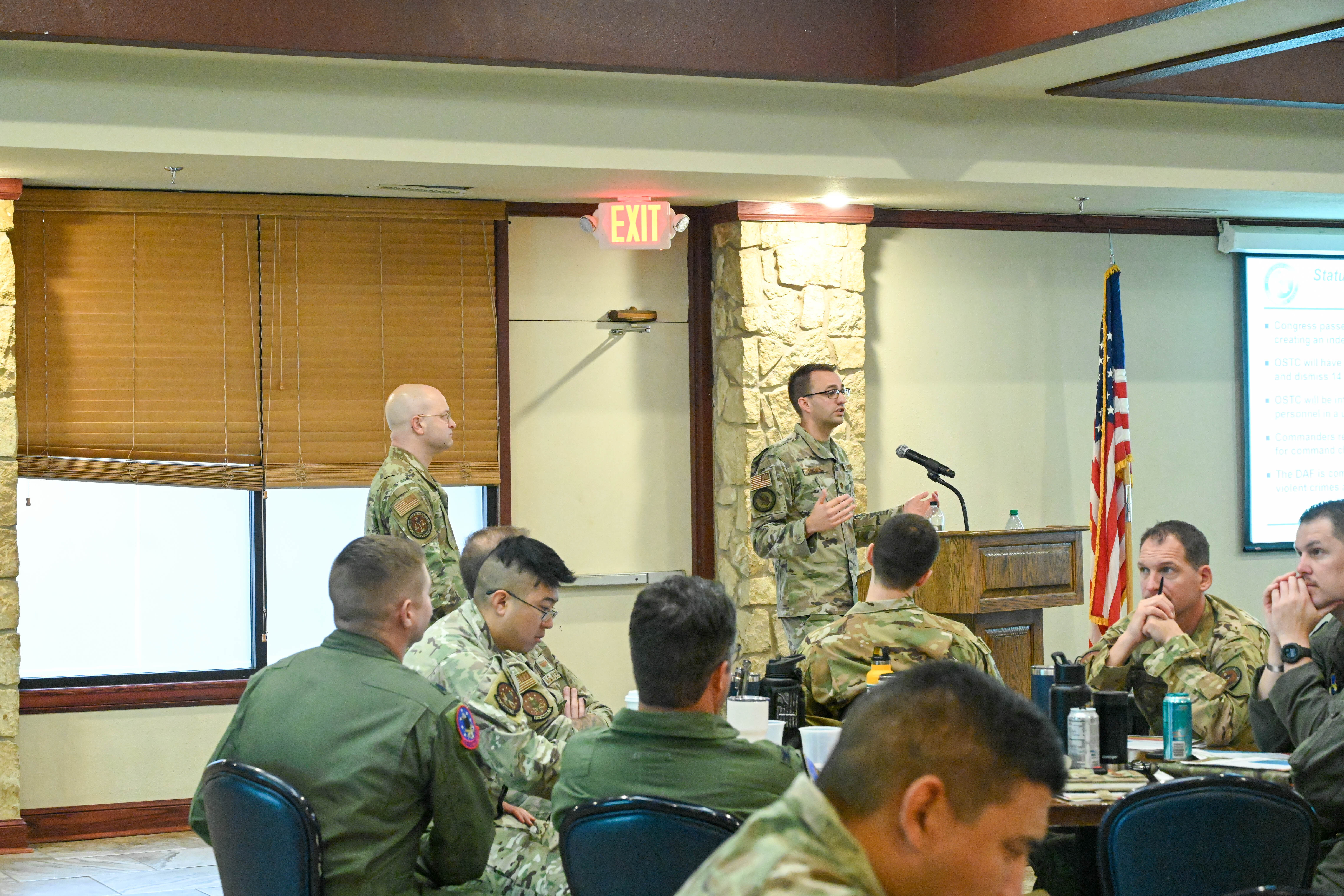 U.S. Air Force Maj. Christopher Mitchell, Headquarters Air Force chief of joint service policy and legislation, speaks during a military justice symposium at Altus Air Force Base, Oklahoma, Oct. 23, 2023. The discussion was centered around an executive order made earlier this year regarding the Office of Special Trial Counsel. (U.S. Air Force photo by Senior Airman Miyah Gray)