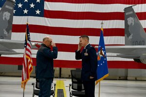 U.S. Air Force Senior Master Sgt. Brian Brown stands next to Col. Adam Gaudinski, the 173rd Fighter Wing Commander during his promotion ceremony to the highest enlisted grade, December 20, 2024, at Kingsley Field in Klamath Falls, Oregon. Gaudinski presided over the official ceremony and all the